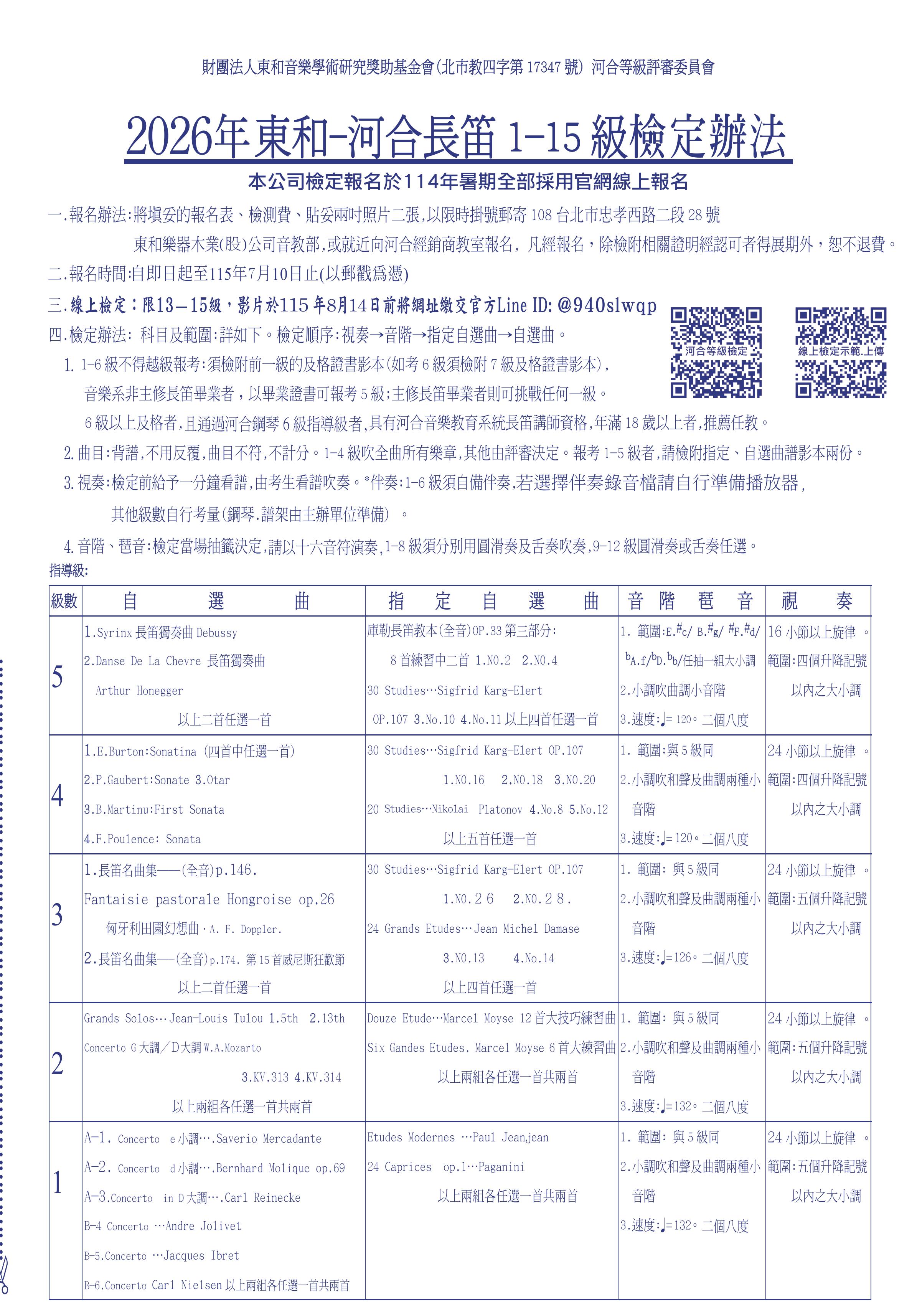 【簡章】2026夏季長笛1-15級檢定簡章|報名簡章