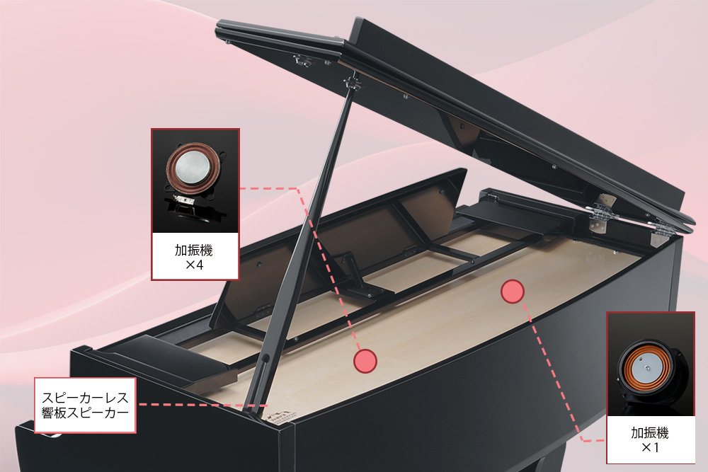 響板和五個加振器再現了演奏型鋼琴的聲音傳播。