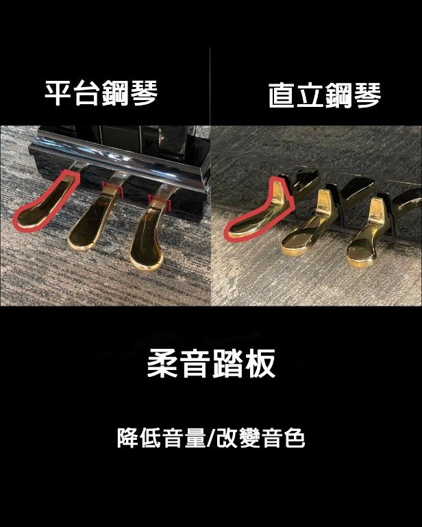 左側柔音踏板的功能在平台鋼琴和直立鋼琴上雖然機制不同,但都能達到柔化音色的效果。