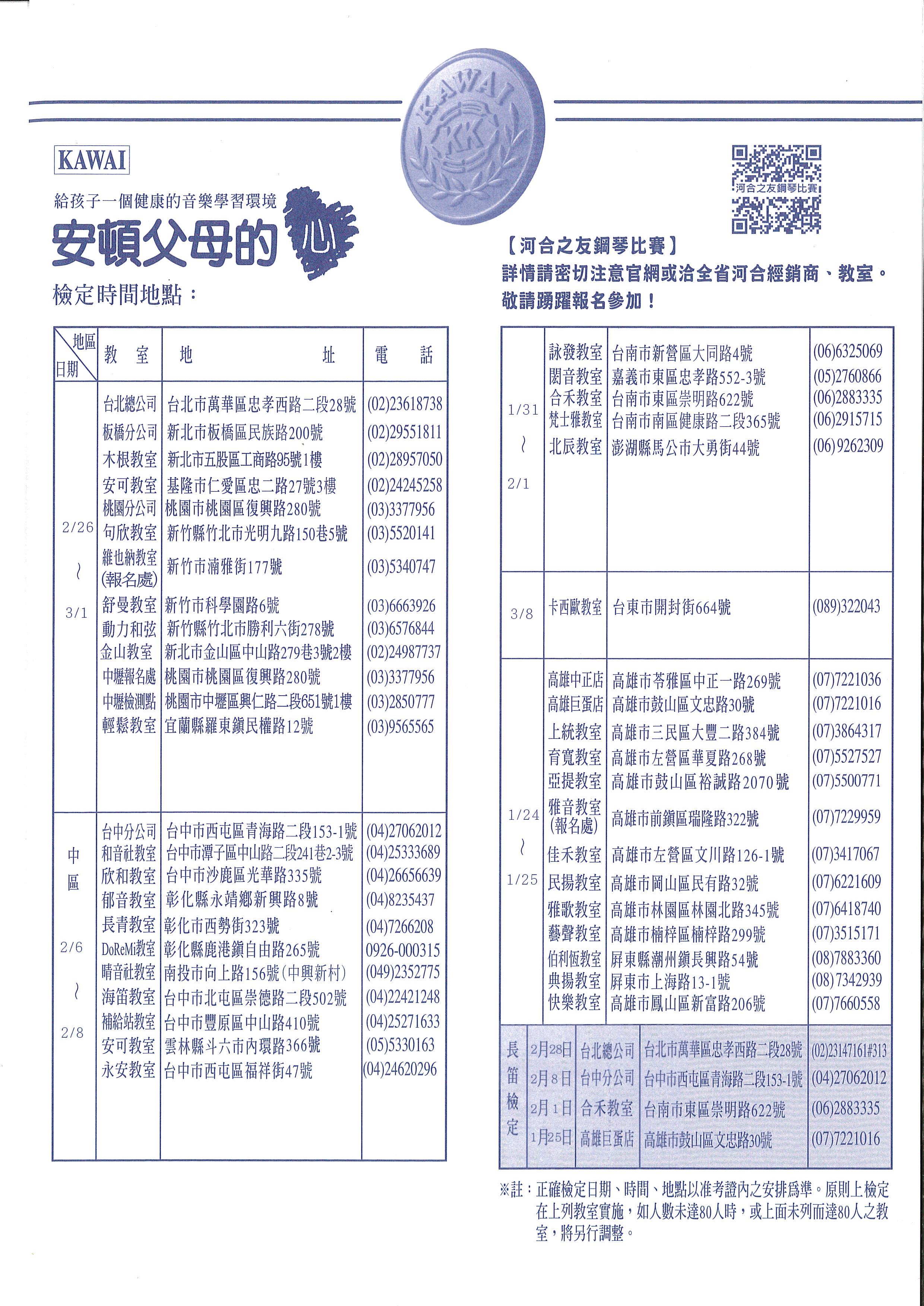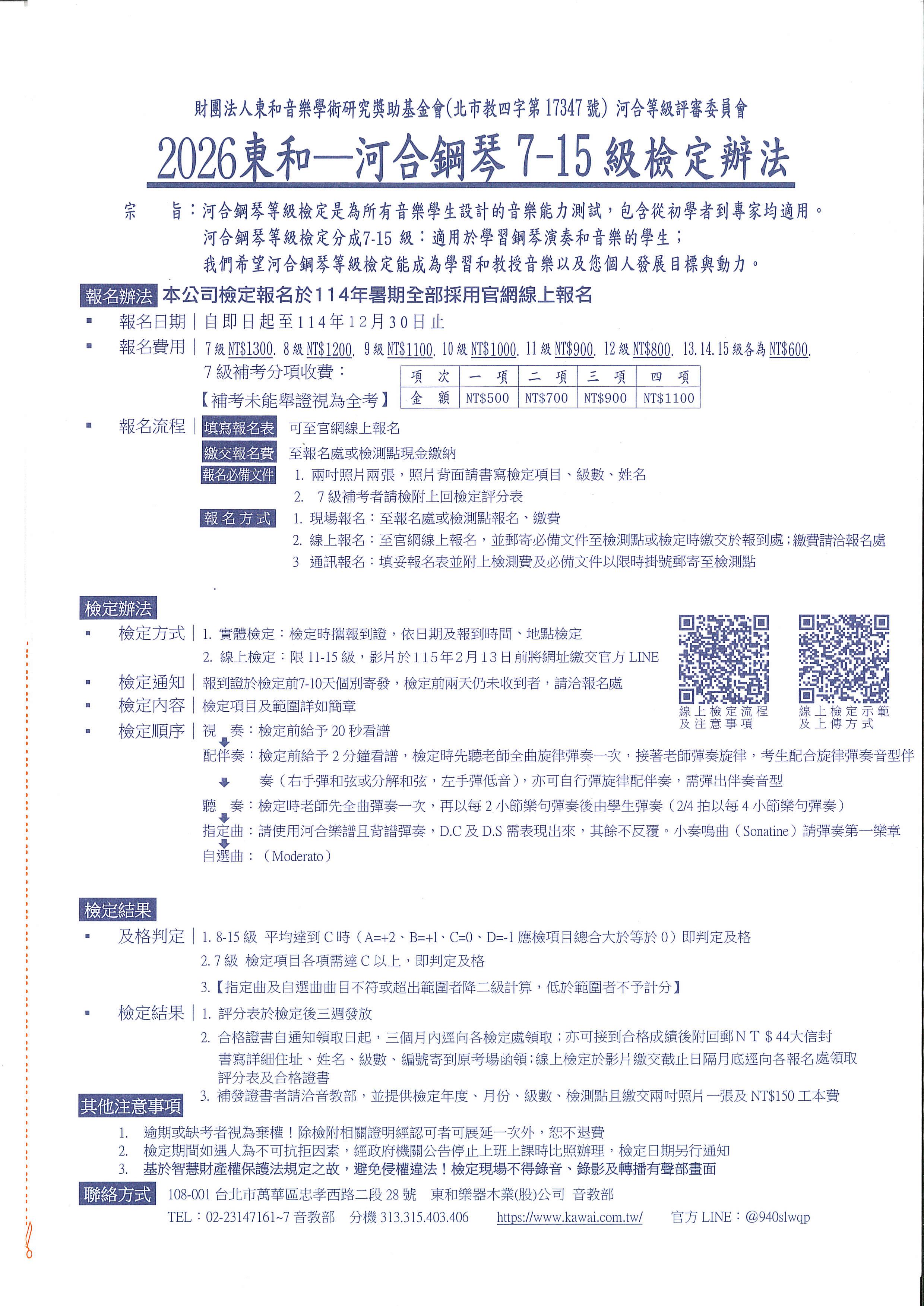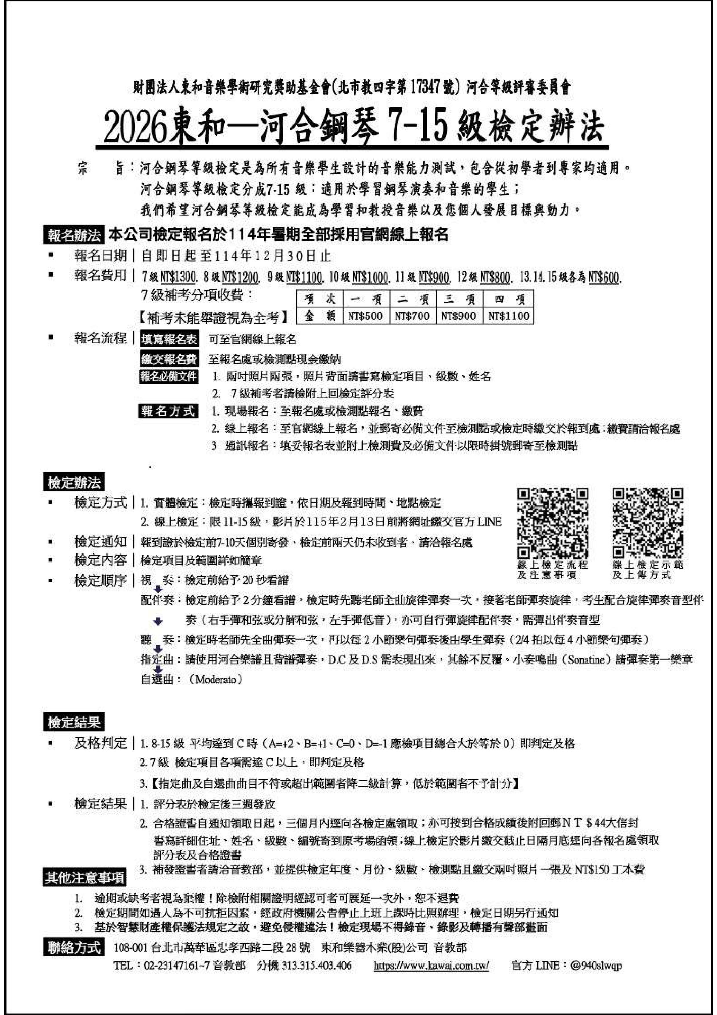 【簡章】2026春季河合鋼琴7-15級檢定|報名簡章