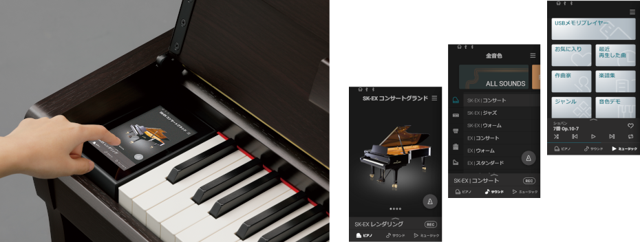 《NEW》 搭載5吋彩色液晶觸控面板,可以像智慧手機般簡單地進行操作。能夠集中精神演奏的”鋼琴模式”裡可以自由選擇並簡單調整SK-EX/EX/SK-5/直立式鋼琴等音色,此外,也能夠像演奏清單般輕鬆選擇"最近演奏過的音色清單”和“推薦音色清單""喜歡的音色清單”等超越前作的操作性。