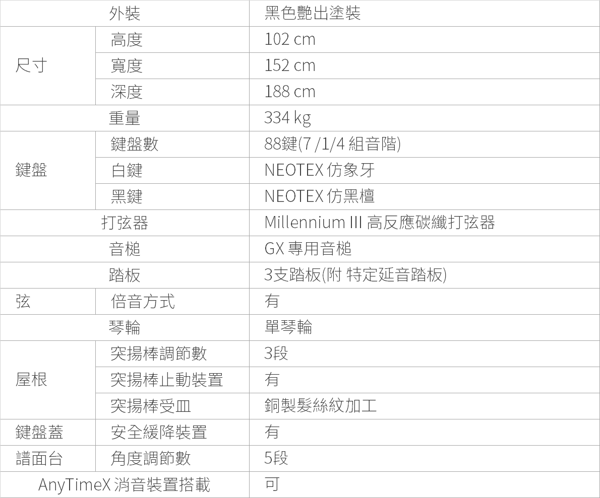 外觀設計上,腕木和譜面台採用優美柔滑的曲線,在傳統造型之中確立獨樹一格的高尚品味。為了提升琴體韌性所加寬的前框厚度,是GX系列平台鋼琴外觀上最大的特徵。